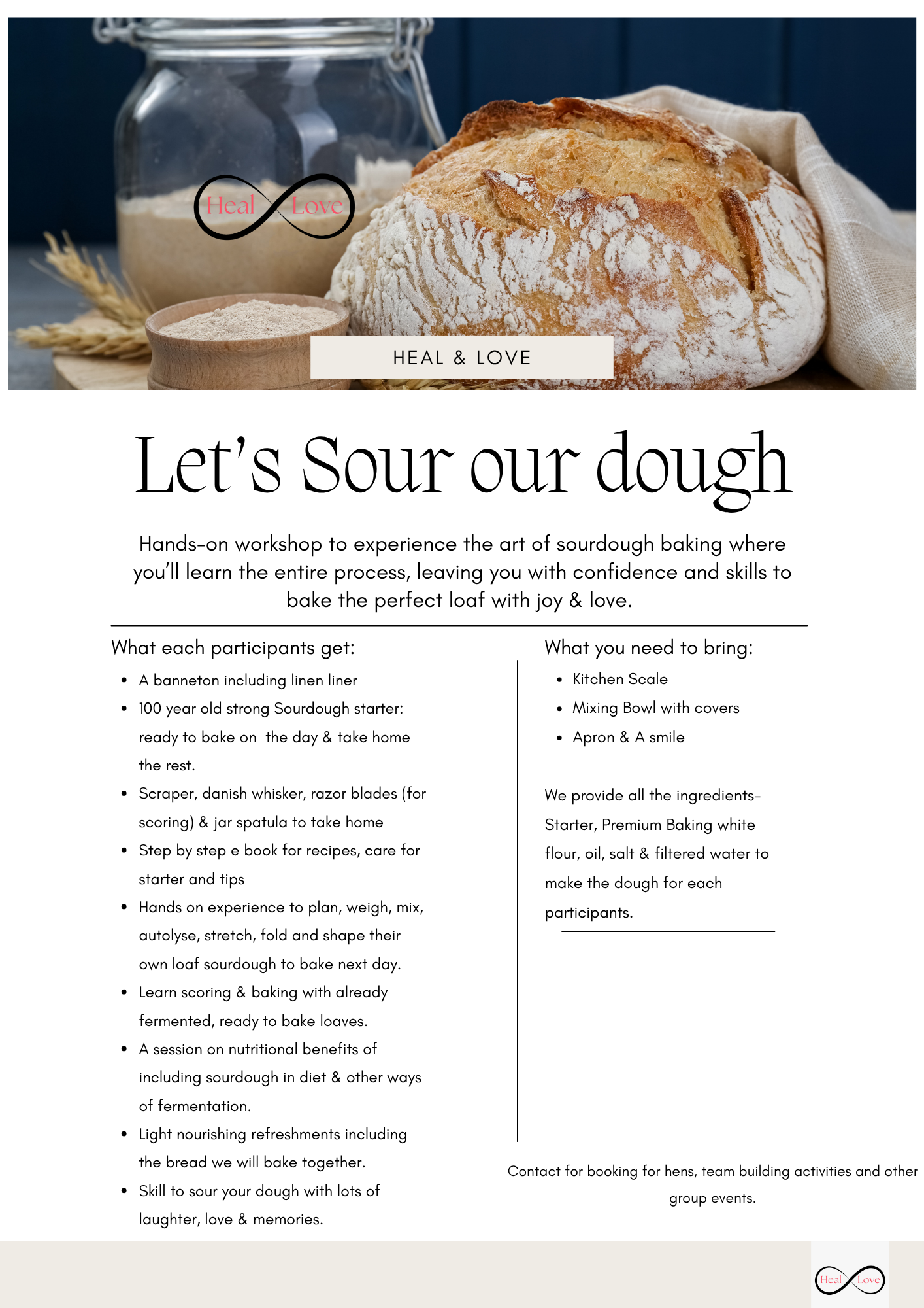 Every participant receives a thoughtfully curated take-home kit that includes a 100-year-old strong sourdough starter, a banneton with linen liner, essential sourdough tools, a step-by-step eBook, and nutritional insights. You'll gain guidance through every stage and leave with the skill to sour your own dough, infused with laughter, love, and confidence.